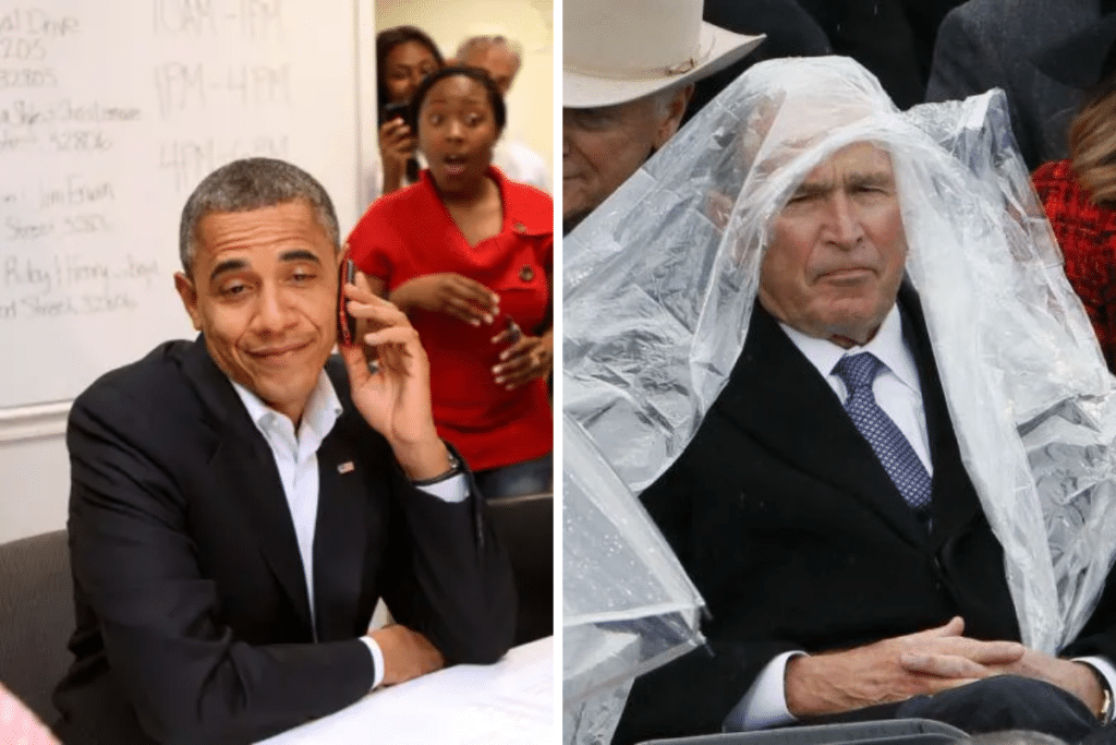 For all their formality, presidents and their families can’t escape life’s most human (and hilarious) moments. From Ronald Reagan clowning around at the podium to George W. Bush losing a battle with a poncho, these snapshots remind us that the White House is home to bloopers as well as history. Whether it’s a First Lady dancing, a president wrangling pets, or a baby giving the ultimate unimpressed face, these awkward and candid photos show America’s leaders at their most relatable—and funniest.