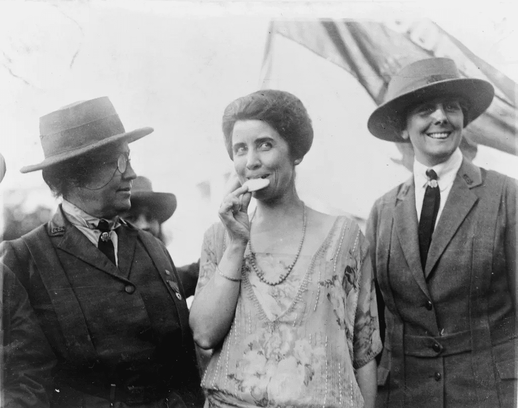 After Woodrow Wilson’s stroke in 1919, his wife Edith Wilson quietly took on an extraordinary role, managing access to the president and shaping decisions behind the scenes. But here she is in a lighter moment, playfully nibbling on a cracker alongside women’s rights activists, looking far less like a gatekeeper.